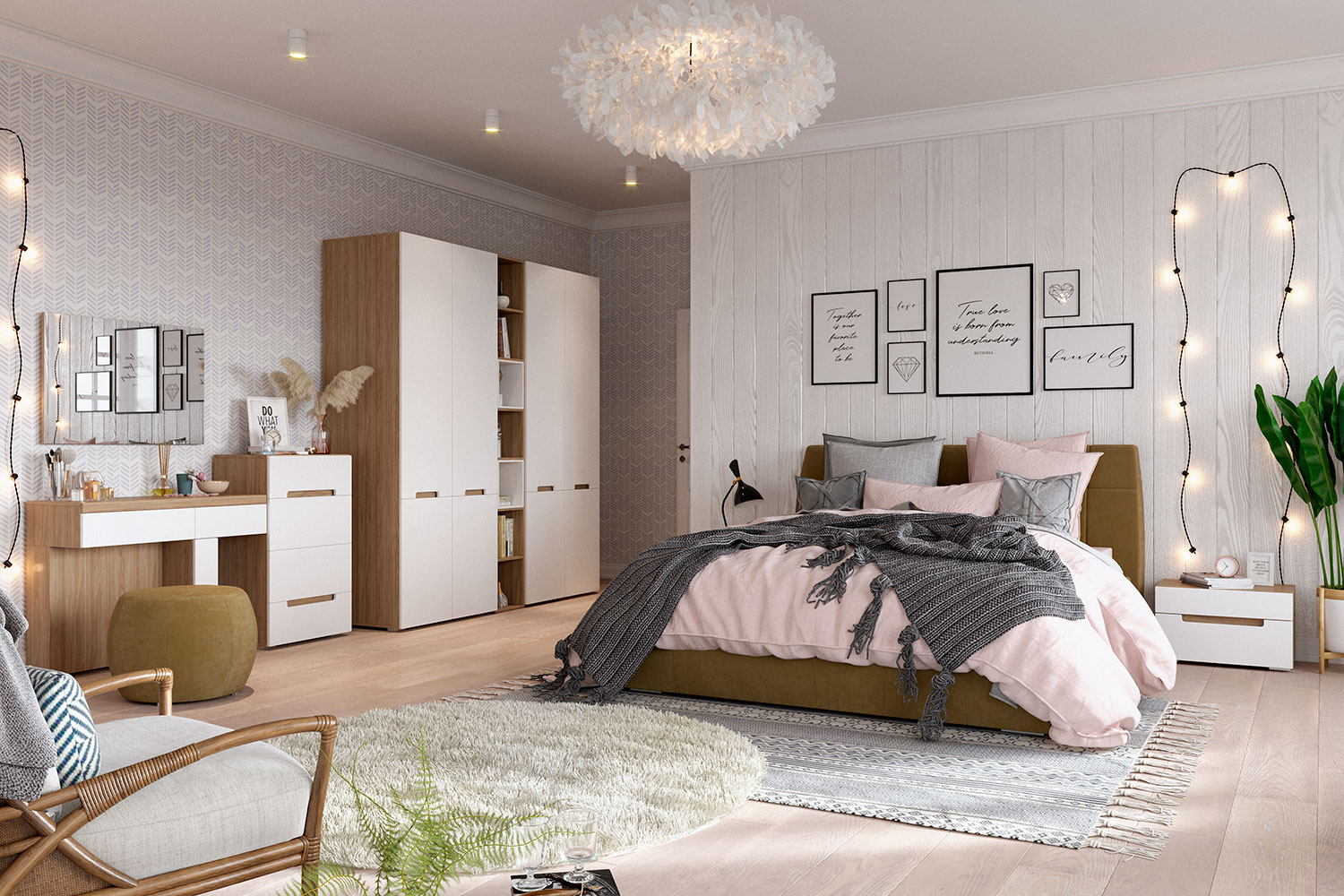 В зависимости от стиля, который вы хотите создать в вашем доме, можно дополнительно подобрать минималистичные торшеры или стеллажи — для эко или скандинавского стилей, аксессуары из металла или стекла — для «легкого» лофта, графичные постеры — для минималистичного интерьера. Не забудьте про туалетный столик, который сделает утренние и вечерние ритуалы еще приятнее.