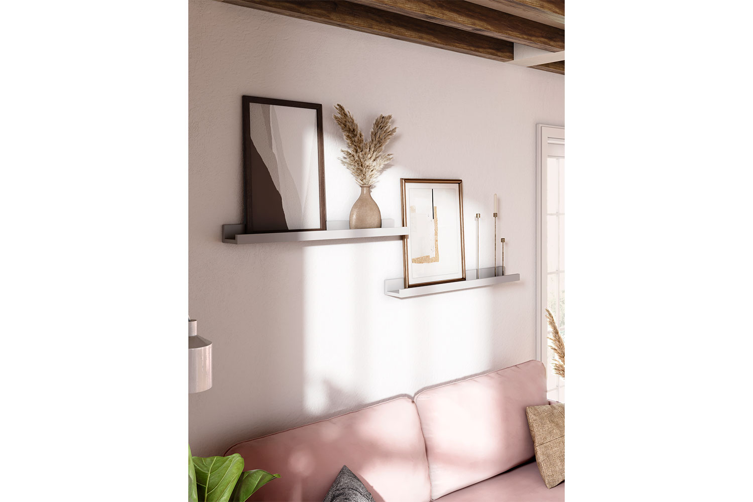 Полку можно использовать в композиции — комбинировать несколько вариантов размеров, чтобы создать настоящую галерею семейных фотографий или картин. Передний ограничительный профиль не даст соскользнуть предметам с полки.
