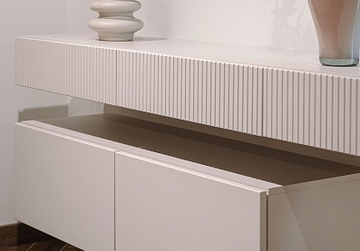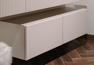- Ящики с направляющими со встроенным механизмом и открыванием ящика нажатием на фасад — Push to open. Для срабатывания механизма между корпусом тумбы и фасадом предусмотрен зазор не менее 4 мм.