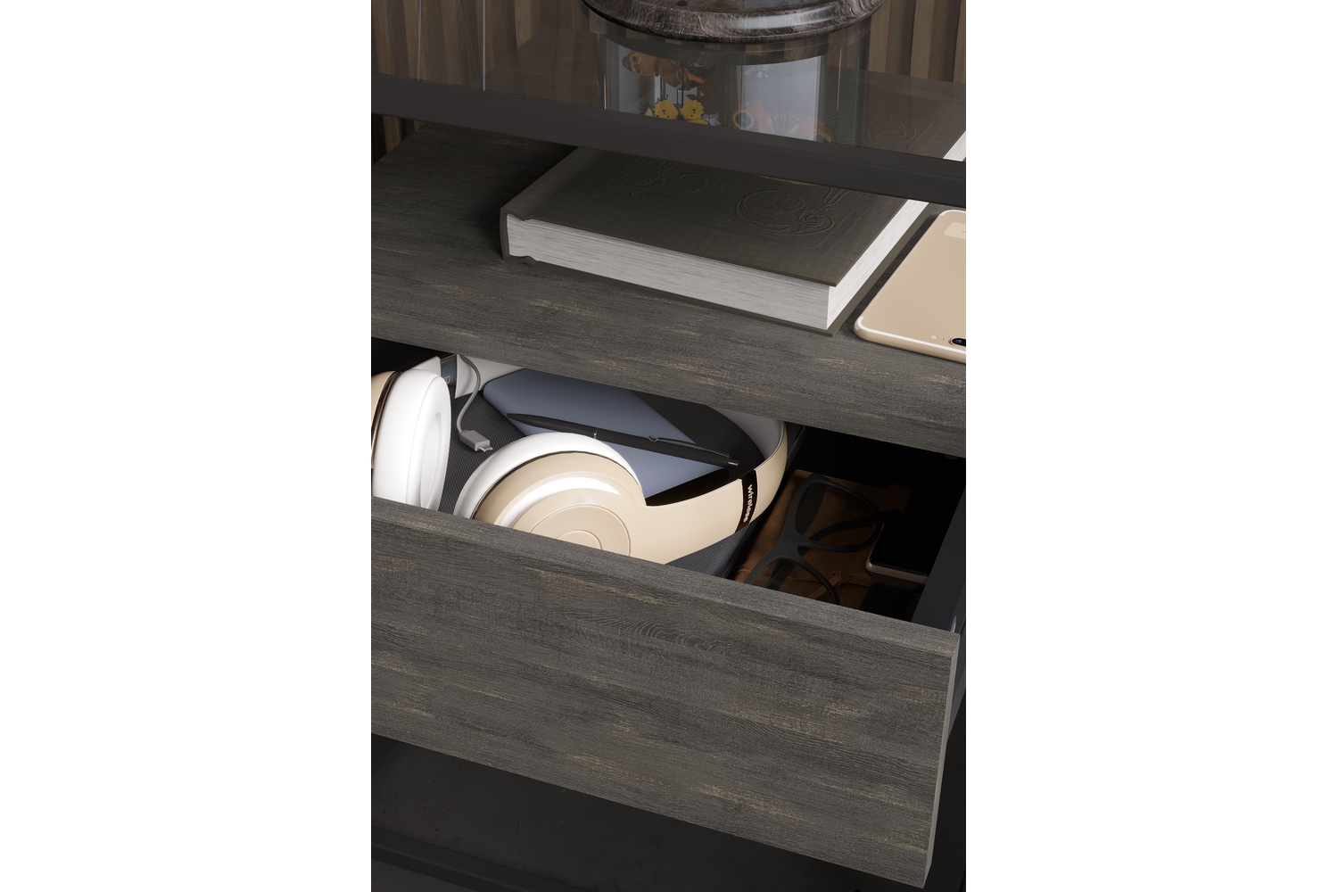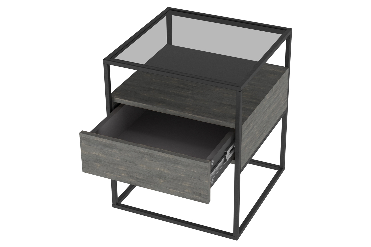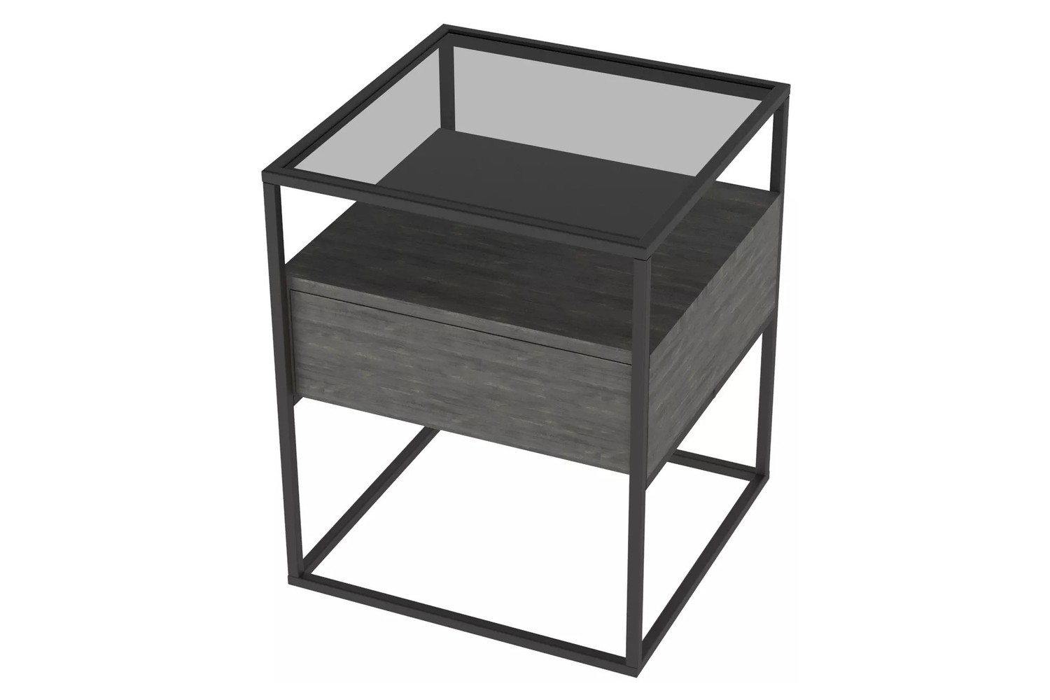 Прикроватная тумба Эйд выполнена в современном лаконичном стиле и уместно дополнит интерьер гостиной. Стильная тумба приковывает внимание, прежде всего, своим исполнением: комбинацией используемых материалов. Стеклянная столешница из тонированного закаленного стекла в сером цвете дополнена полкой и ящиком для удобного хранения подручных вещей с системой открывания PUSH-TO-OPEN. А прочный металлический каркас из профиля толщиной 15 мм обеспечивает высокую прочность и устойчивость.