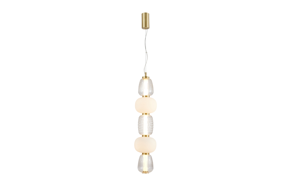 Чередование стеклянных плафонов разной формы, цвета и рисунка, а также цветовое решение каркаса в золоте создает насыщенный сложный и дорогой образ. Металлический каркас цвета золота, плафоны в виде бусин разнообразных форм из выдувного стекла двух видов - прозрачного и цвета опала.