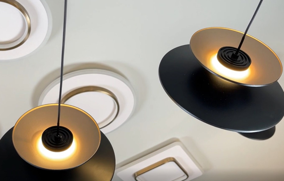 Потолочная люстра Platt напоминают по форме катушку благодаря соединению конусов, элегантно подсвеченных светодиодным модулем. Матовый черный цвет придает элегантность и стиль, создавая контраст с насыщенной песочно-золотой окраской, которая привносит тепло и уют. Внутренняя золотая поверхность плафонов отражает свет, делая помещение светлее и ярче, создавая комфортную атмосферу. Регулируемая высота.