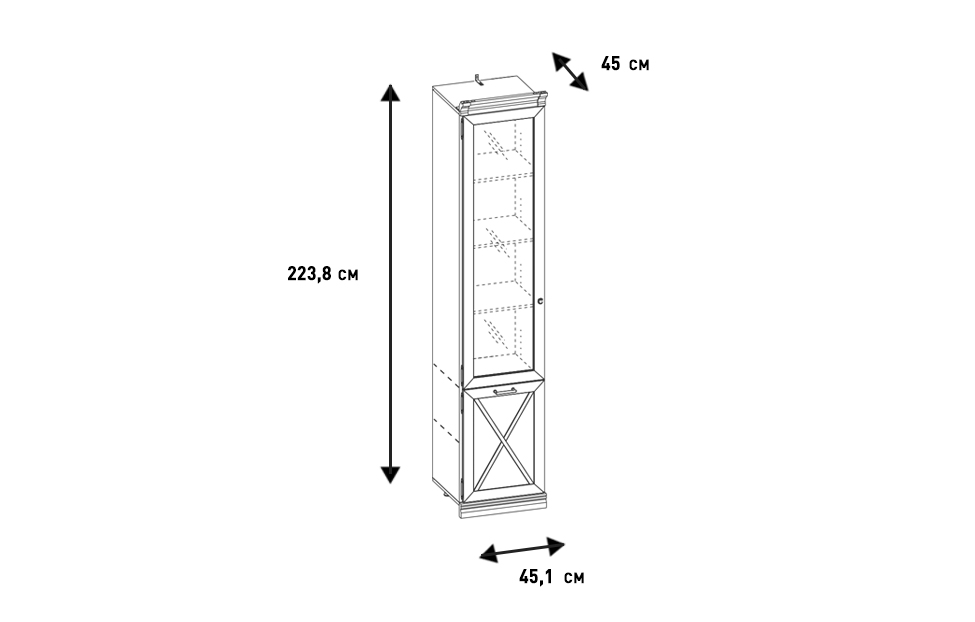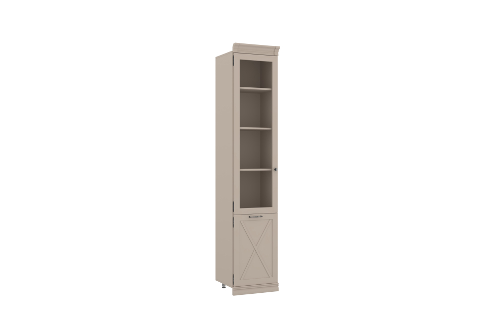 - В верхнем отделении — три съемные полки из ЛДСП за рамочным фасадом (вставка стекло), в нижнем отделении — одна съемная полка из ЛДСП за рамочным фасадом (вставка ЛДСП с фахверком);