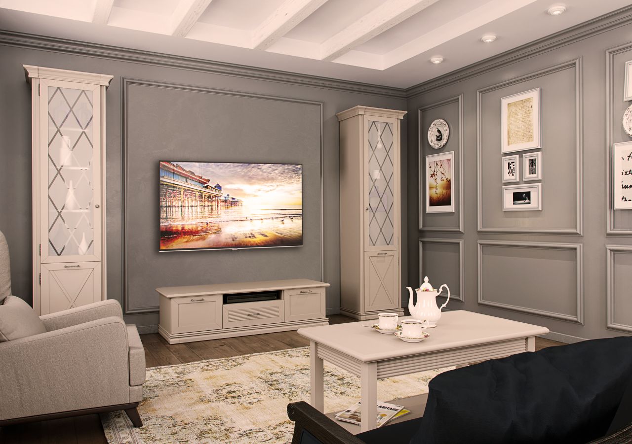 Мебель выполнена из экологичной древесной плиты. Рамочные фасады украшены стильными латунными ручками, отделанными под античную бронзу. Меблировка отличается вместительностью: два высоких шкафа с застекленным верхом, ТВ-тумба и настенные полки позволяют хранить под рукой все необходимые вещи. Бесшумную эксплуатацию обеспечивает система скрытых направляющих со встроенным демпфером и петли с доводчиками. Качественная фурнитура гарантирует надежность крепления.