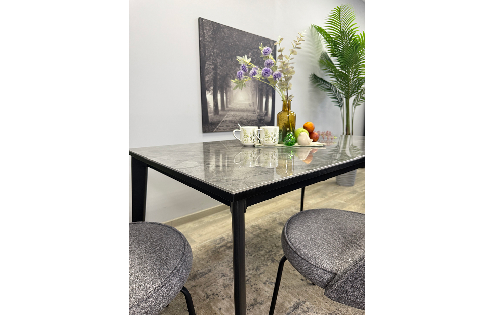 Стол оснащен дизайнерскими ножками, отличающимися тонкостью и высокой прочностью, что позволяет разместить два крупных стула вдоль одной стороны, гарантируя его надежную устойчивость.